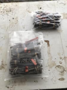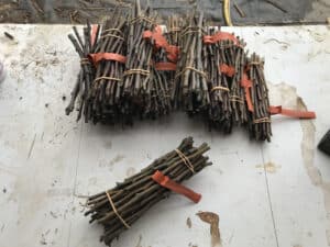 Il ne reste plus qu’à les mettre en sac pour les stocker au frigo afin de retarder au maximum le redémarrage des bourgeons qui, même une fois prélevés, sont susceptibles de se réveiller et gonfler. Les paquets de greffons sont ressortis et utilisés progressivement pendant les greffages de printemps.