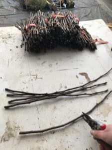Et ensuite ? Les rameaux prélevés sont retaillés à la longueur de l’emballage de stockage, et rassemblés en paquets, sans oublier de les identifier avec une étiquette au nom de la variété.